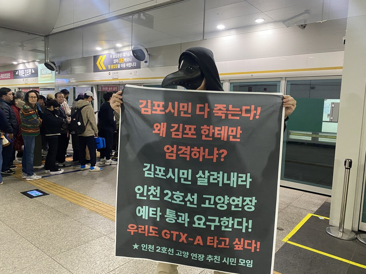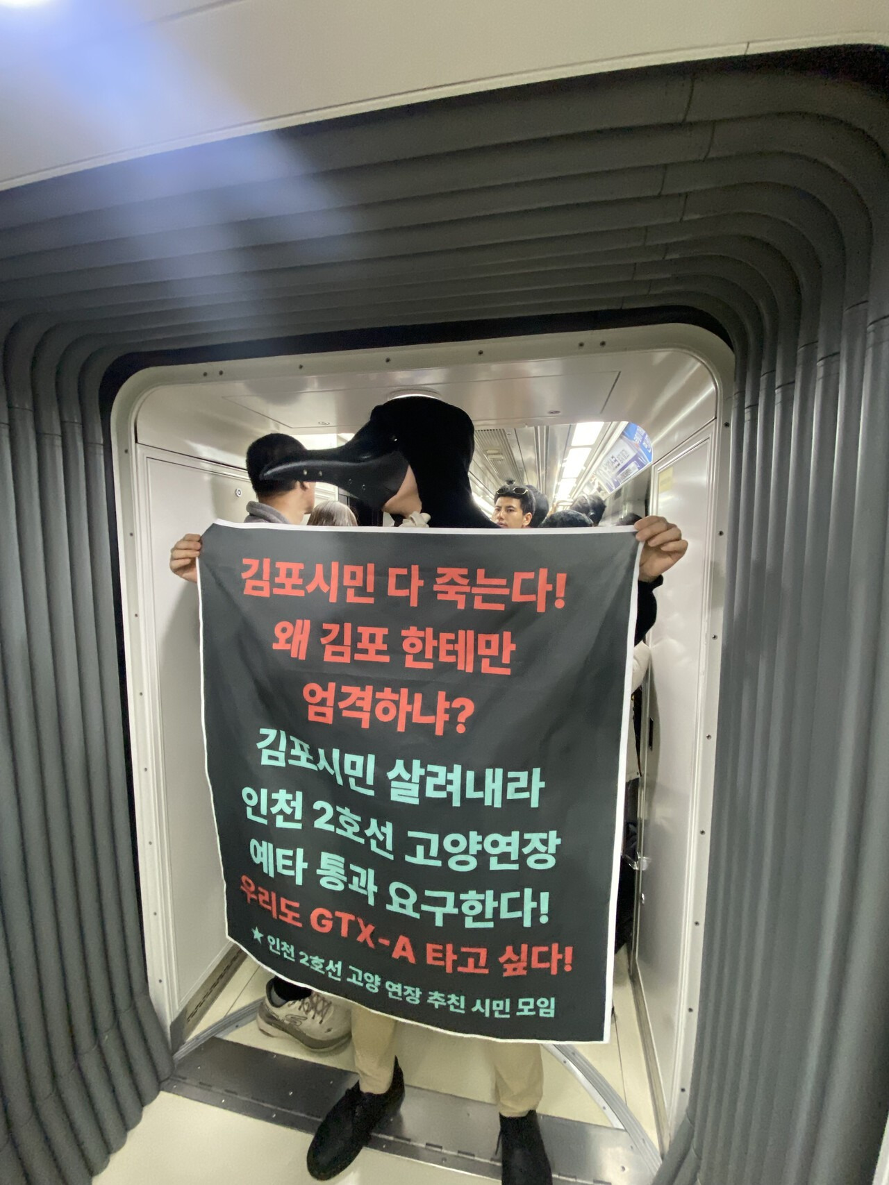 한 시민은 검은 복면을 쓰고 “김포시민 다 죽는다! 왜 김포한테만 엄격하냐?”는 문구가 적힌 피켓을 들고 지하철 내에 섰다. 피켓에는 “김포시민 살려내라. 인천 2호선 고양연장 예타 통과 요구한다. 우리도 GTX-A 타고 싶다”는 문장이 붉은색과 청록색 글씨로 선명히 새겨져 있었다.
