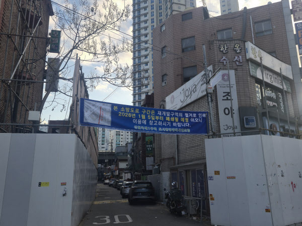 [땅집고] 소방도로 구간과 폐쇄 예정 안내 현수막이 걸려있다./박영규 기자