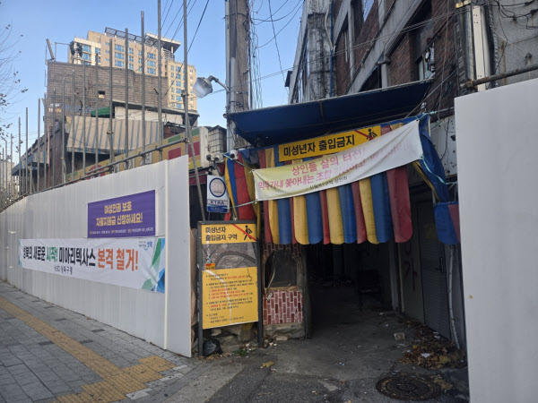 지난 8일 찾은 서울 지하철 4호선 길음역. 10번 출구로 나오자 ‘미성년자 출입금지’ 팻말과 함께 ‘성북의 새로운 시작, 미아리 텍사스 본격 철거’라는 현수막이 보인다. 이 곳은 서울의 마지막 성매매 집결지로 불렸던 ‘미아리 텍사스’가 있던 자리. 현재 신월곡1구역 재개발 사업지로 묶여 철거 작업이 한창이다. 이제는 인적을 찾아보기 어려운 좁은 골목길에 들어선 건물마다 유리창이 깨져있고 사업지 상당 부분에 가벽이 설치돼있다. 이 가벽을 두고 신월곡1구역과 최고 23층 높이 아파트 ‘길음역 서희스타힐스’가 맞붙어있어 분위기가 크게 대비된다.